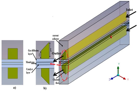 This study investigates a single-channel PEMFC with straight gas channels and a planar flow field design. The geometrical models of the selected PEMFC configurations were developed using ANSYS Design Modeler, as illustrated in Figure 1a,b.