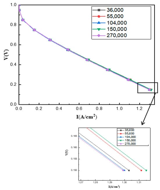 The resulting polarization curves for all five cases, shown in Figure 2, demonstrated very close agreement. The mesh comprising 36,000 elements was selected for all subsequent simulations, as its I-V curve occupied a central position among the tested cases, confirming its representativeness. This configuration offers an optimal balance, being the smallest mesh that substantially reduces computational expense without compromising result accuracy.