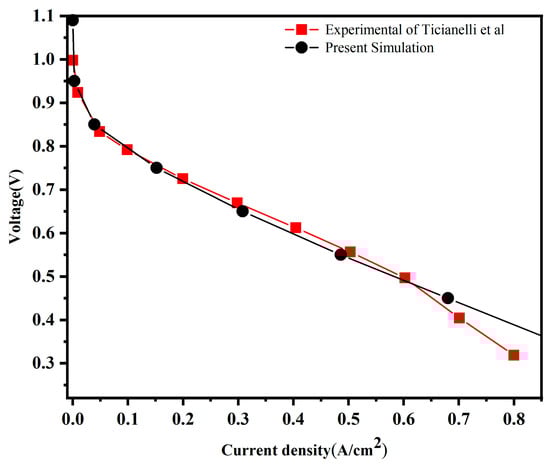The accuracy of the computational model was verified by comparing the simulated polarization curve with published experimental results from Ticianelli et al. [33], as presented in Figure 3.