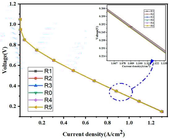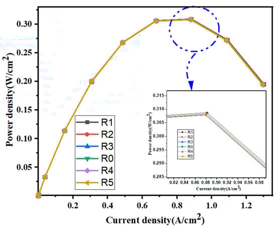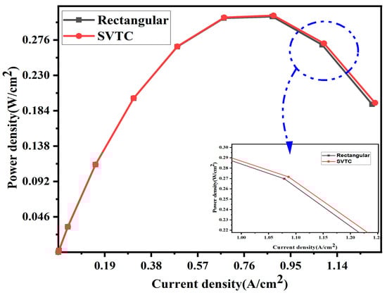 As shown in Figure 5, the comparison of power density curves clearly demonstrates the superior performance of the SVTC channel configuration compared to the conventional rectangular design. The SVTC achieves a higher peak power output, suggesting more efficient fuel utilization and enhanced water and gas management within the flow field. At a cell voltage of 0.35 V, the rectangular channel produces a power density of 0.306425 W/cm2, whereas the SVTC yields 0.30786 W/cm2. Although the difference is modest, the consistent improvement underscores the influence of channel geometry on overall output efficiency.