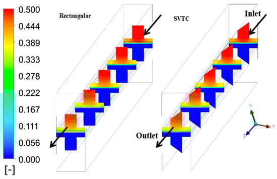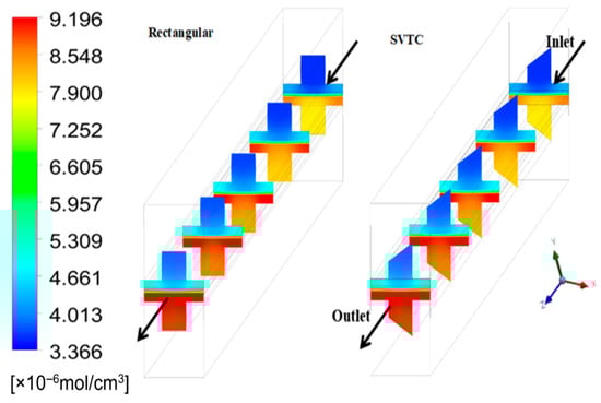 Figure 6. Comparative distribution of hydrogen mass fraction in anode channels for rectangular and SVTC designs (mass fraction, dimensionless).