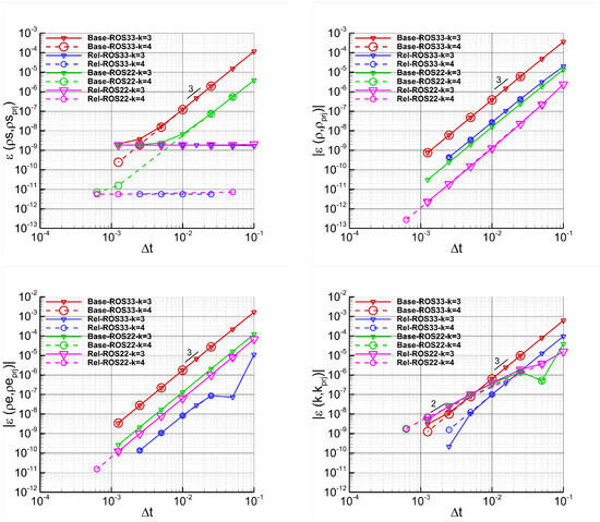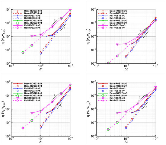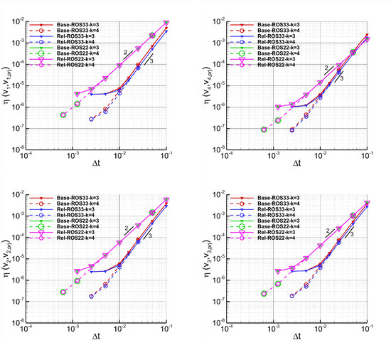 Vortex–Time refinement study. Simulations performed with (Rel) and without (Base) relaxation, the ES flux, ROS22 and ROS33, dG approximations, and without over-integration. The plots show the errors of the entropy variables , with , as a function of the time step sizes.