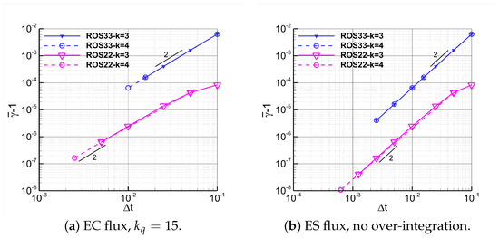 In Figure 3 the convergence of is shown for both EC and ES fluxes, where is the average value of the relaxation parameters over time. Since this is a simple transport problem, the values of computed at each time level are very close to their mean value, which is why was selected for representation. It can be observed that the theoretical convergence order of is satisfied for the ROS33 scheme, while for the ROS22 scheme the convergence order exceeds the theoretical value, approaching 2 for sufficiently small . Additionally, since for ROS22 is at least one order of magnitude smaller than for ROS33, ROS22 better preserves entropy. This could explain why for ROS22 the accuracy of the entropy variables is roughly the same with or without relaxation, whereas for ROS33 the relaxation technique leads to a slight improvement in accuracy compared to the baseline method, as shown in Figure 1 and Figure 2.