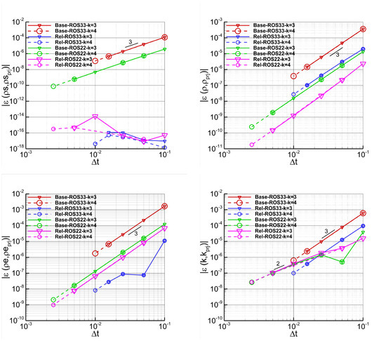 Vortex–Time refinement study. Simulations performed with (Rel) and without (Base) relaxation, the EC flux, ROS22 and ROS33, dG approximations, and . The plots show the absolute values of the errors of several variables as a function of the time step sizes.