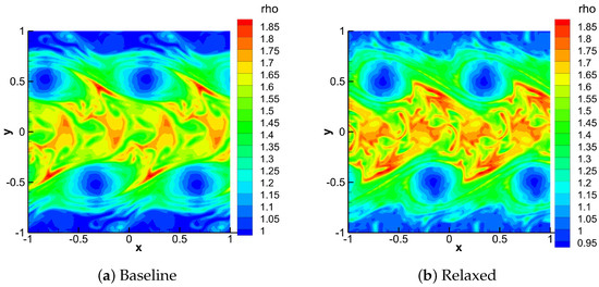 It is also worth noting that, even when both simulations, with and without relaxation, are run to completion, the resulting solutions exhibit noticeable differences. As an illustrative example, Figure 6 presents the density fields obtained without (Baseline) and with (Relaxed) the relaxation technique at . The simulations were performed with ROS33 with , a dG approximation and without over-integration. Both schemes capture the expected flow features of the instability, including the main vortices and the two mixing layers. However, clear differences arise in the two plots. In particular, the spatial position of the vortices clearly differs between the two formulations, a discrepancy consistent with the high sensitivity of compressible Kelvin–Helmholtz dynamics to small changes in numerical dissipation. In the baseline solution, the regions surrounding the vortices appear more irregular, while the relaxed solution exhibits a clearer separation between the vortical structures and the surrounding flow. Moreover, the density inside the vortex cores differs: the relaxed solution exhibits a stronger rarefaction, while in the baseline case the density drop is partially smeared out, indicating the presence of stronger numerical diffusion. In the central region between the two shear layers, the relaxed solution exhibits sharper gradients and thinner filaments, whereas the baseline solution is overly smoothed, suggesting the presence of stronger numerical diffusion.