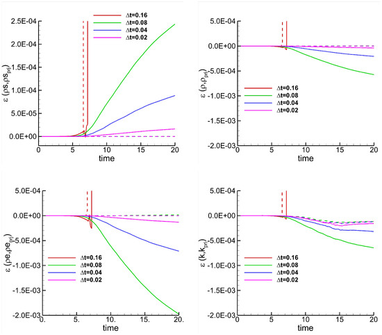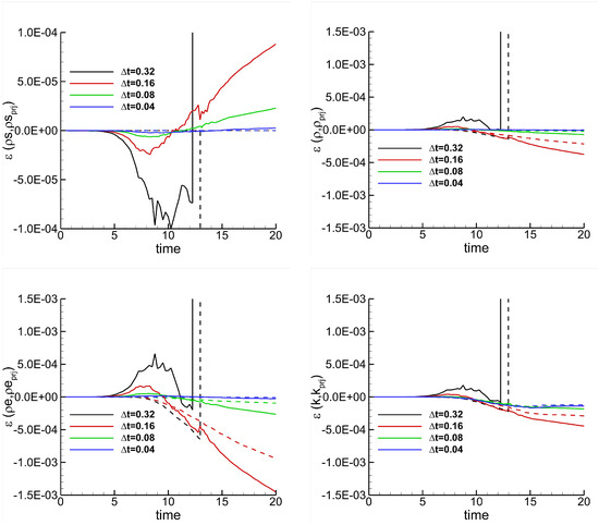 TGV–Time refinement study. Simulations performed with (dashed line) and without (continuous line) relaxation, the EC flux, ROS33, dG approximation, and . The plots show the errors of several variables as a function of time for different time step sizes.