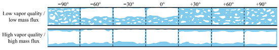 Regarding heat transfer investigations, Lips and Meyer [8] experimentally evaluated the HTC during R134a flow condensation at a of 40 °C and G between 100 and 400 kg/m2s in an 8.38 mm diameter channel under inclinations varying from −90° to 90°. According to them, the thermal resistance in a condensation process is mainly induced by the heat conduction thermal resistance in the liquid film. Thus, the HTC is strongly dependent on the distribution of the liquid in the tube and, as a consequence, on the flow pattern, which can be influenced by the inclination angle. Based on flow visualization and heat transfer measurements, these authors concluded that the effect of inclination is significant in conditions of low vapor quality (x) and low mass velocity (G), under which different flow topologies are observed depending on the orientation, as shown in Figure 1.