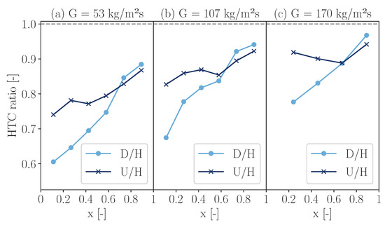 Thus, it can be summarized that the maximization of the HTC occurs with the increase in mass velocity and vapor quality. When considering low mass velocities, where the flow orientation becomes relevant, the upward flow generally stands out compared to the downward flow.