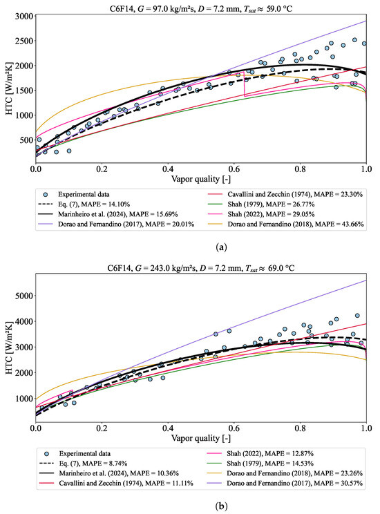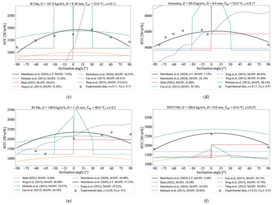 Table 3 compares the predictions of correlations in the literature against the current database for inclined tubes. The criteria used for evaluation were the MAPE, , and . The gray shaded cells are the correlations corrected by the angle factor, , as described in Equation (8). The blue cells are correlations that account for the inclination angle in their original version. The remaining cells are the correlations without angle as the input parameter. It can be observed that for the four gray shaded correlations, the error was consistently reduced when compared to the correlations without the correction factor . In this table, the data are also analyzed separately for both macro- and mini-channels, following the transition threshold of Ong and Thome [7]. The correlations corrected by the factor showed enhanced predictive accuracy for both macro- and mini-channels. For macro-channel data, a higher improvement is noted, corroborating the suggestion that in mini-channels, the gravity force effects are less pronounced. The improvements achieved by the correction factor remained close to 3–4%, depending on the correlation. The lowest MAPE was obtained by the prediction method of Marinheiro et al. [24] multiplied by the correction factor , exhibiting an MAPE of 24.1%. Equation (7) showed a slightly higher MAPE than Marinheiro et al. [24] , a result that can be attributed to the larger database used by Marinheiro et al. [24] to adjust their correlation, which includes more than 12,000 points and 69 different fluids, reinforcing the importance of a comprehensive data bank for adjusting correlations. The correlation of Moradkhani et al. [50] was also evaluated in this work, but for 17 specific datapoints, it returned extremely high HTC values, resulting in an MAPE above 100% for the complete database analysis.