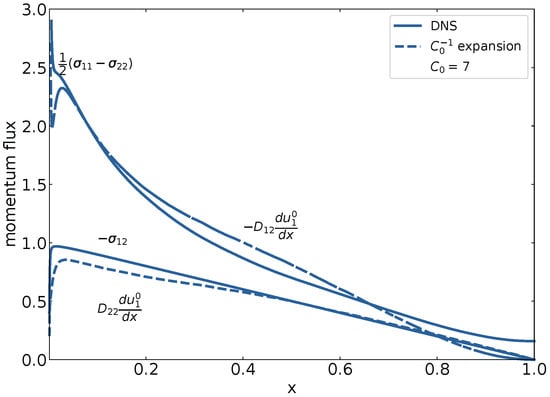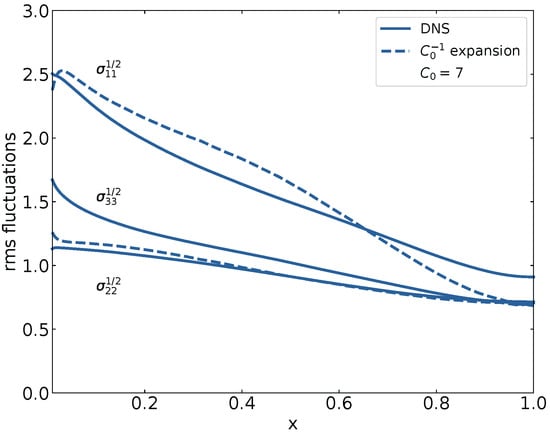 Asymptotic analysis of the boundary and buffer layer reveals unspecified values for covariances at the outer edge of the layer (Ref. [7], Volume 1, pp. 279–281). Normalised with the shear velocity , these values and the distributions of with respect to x are entirely determined by the statistics of the large scales, which are governed by mean flow gradients. It is reflected in the solutions of Equations (112)–(114). Exception is a small drop in the value of 1 of near the wall, which is shown by the DNS (see Figure 8). This drop can be ascribed to viscous effects and cannot be addressed by the solution of Equation (117).