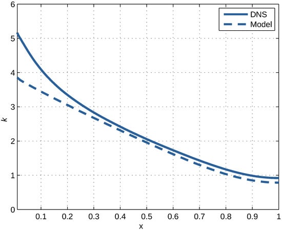 The complete specification of all coefficients in Equation (106) is achieved by determining the value of . Matching the solution for as a function of to the results of DNS reveals a value for of (see Section 3.6). This gives good agreement over the entire range of values, i.e., from the wall to the centre of the channel (see Figure 8).