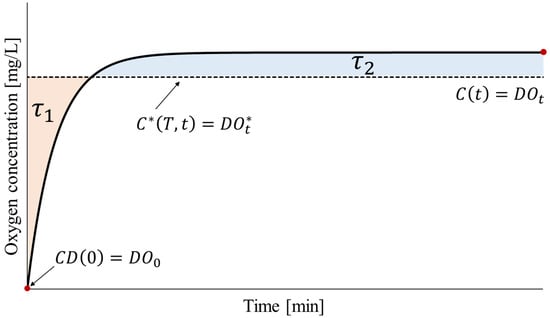 Equation (1) is valid for any time at which oxygen concentration is lower than oxygen saturation concentration, and Equation (2) is valid for any time at which oxygen concentration is higher than oxygen saturation concentration. Equations (1) and (2) are our original proposition to formulate experiments as optimization problems. In Equation (3), is obtained from experimental results and calculated as finite differences between experimental data points. Equation (4) is a nonlinear regression from the ISO 5814:2012 data.