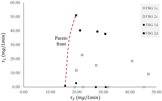 Figure 4 shows the plotted values for , and . The dashed line shows the Pareto front of the non-dominated solutions (i.e., improvement of is only possible by worsening , and vice versa). As shown in the figure, it is better to place an obstacle in the diverging section to attain high DO values.