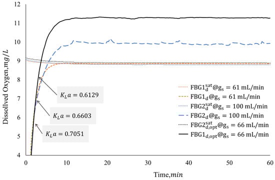Since FBG1 is almost asymmetrical, there is not an important difference between FBG1c and FBG1d. Since FBG2d exhibited the best performance with high values for , additional experiments were conducted in more detail, and the results are shown in Table 2. It is worth mentioning that the DO meter was recalibrated, and experiments were conducted again.