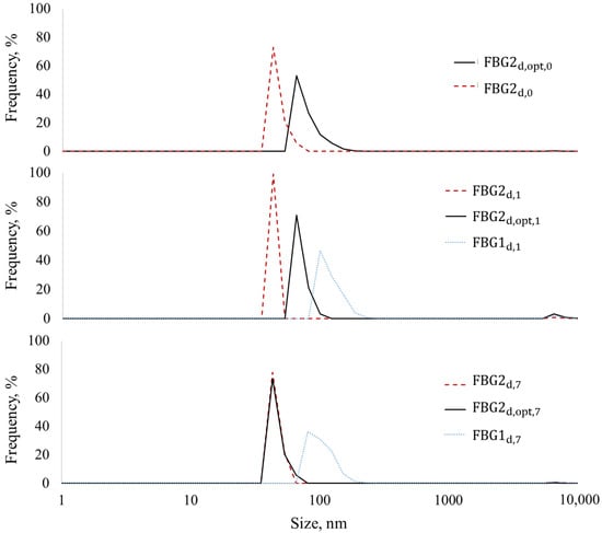 Table 3 shows the zeta potential mean value of the generated FBs at different measurement times to study their variation over time. Figure 7, Figure 8 and Figure 9 show the zeta potential distribution for the generation of FBGs and conditions in Table 3. The zeta potential was almost the same for all the evaluated solutions, ranging between −19 and −28 mV. Despite the low values, the zeta potential does not change much over time for , and . However, for , the zeta potential decreased over time.
