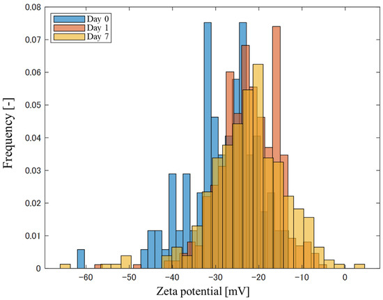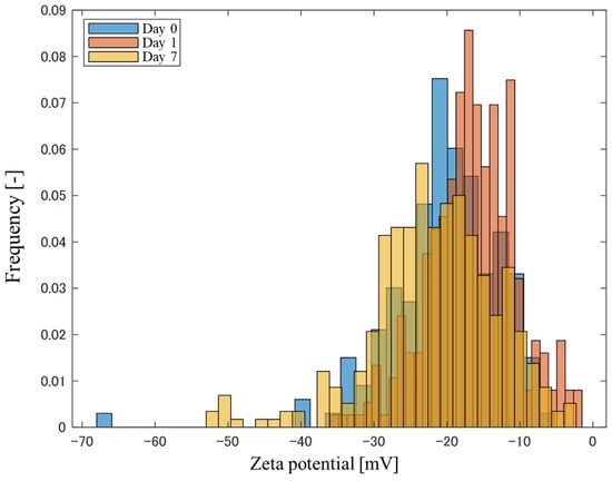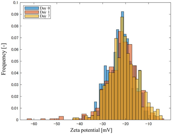 The zeta potential distribution frequency for was almost the same over time. However, small variations after generation are observed. The frequency shifts toward less negative values one day after generation, and toward more negative values seven days after generation. Thus, the most negative zeta potential distribution for was attained seven days from generation due to an increase in the frequency of smaller UFBs.