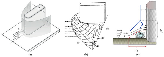 One of the most frequently considered model problems in the literature is supersonic flow past a blunt body mounted on a plate [10,11,12,13,14,15,16,17,18,19,20,21]. The problem statement is presented in Figure 1a. A blunt body is located on a plate streamlined by a supersonic flow. The head shock wave arising in front of the body is a three-dimensional surface of the density gradient. The growing boundary layer, which also has a three-dimensional structure, flows onto the shock wave. In this problem, the effects of viscous-inviscid interaction are clearly manifested; the unfavorable pressure gradient created by the bow shock wave lifts off the boundary layer, and a recirculation bubble forms in front of the leading edge. The protrusion of the recirculation zone creates a separation shock which intersects with the bow shock wave. This intersection point is called the “triple point” because a λ-shaped shock-wave configuration is formed there. The flow behind the shock wave degenerates into a series of three-dimensional vortices which are heterogeneous in structure. As a result, an extended separation region with a chain of vortices is formed in front of the body, each of which becomes a “head” of a horseshoe-shaped vortex enveloping the body, the ends of which extend downstream in both directions (Figure 1b). At some distance downstream, the vortices degenerate and are carried away by the main flow. The separation zone induces oblique compression waves that intersect the bow shock, which leads to curvature of the bow shock in the interaction region. These processes strongly influence the flow structure, aerodynamic drag and the parameters of the impact on the body surface.