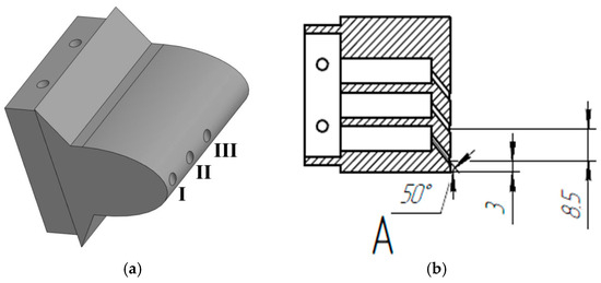 The work investigated the flow around two models: semi-cylinders blunted along a circle and along an ellipse (see Figure 3). The depth of the models was 40 mm. The front and rear surfaces of the model were planes pressed against the viewing windows. Three piezoelectric sensors were installed in the model as shown in Figure 4, using the example of an elliptical model to study the pressure distribution on the surface of the models near the plane of growth of the boundary layer. The first sensor (I) measured the pressure at a distance of 3 mm from the plane, and the next two (II and III) measured it at distances of 11.5 mm and 20 mm, respectively. For this purpose, inclined channels with a diameter of 2 mm were formed in the model, extending onto the frontal surface. The arrangement of sensors and channels inside the model is shown in Figure 4b.