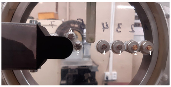 The pressure distribution was also measured on the plate. For this purpose, a special side insert was created instead of a sight glass with built-in pressure sensors. For the experiment, PCB Piezotronics pressure sensors (series 113) were used, measuring the pressure in the range of 0–7 atm with an accuracy of 7 Pa and a signal rise time of less than 1 μs. A photograph of the channel with a model, which was blunted around the circumference, and a side insert are shown in Figure 5. The sensors were located along the axis of the nozzle as it approached the model (3, 4, and 5) and at the side surface (6). The distance from sensor 5 to the front edge of the body was 3 mm, while for sensor 4 it was 33 mm, and for sensor 3, it was 52 mm. Sensors 1 and 2, located at a considerable distance from the surface of the model, were not involved in this work. The photograph was taken through the side viewing window in the transverse direction of the flow of the nozzle, and the flow direction was from right to left.