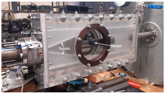 To visualize the flow of the model, a schlieren system was used, the diagram of which is shown in Figure 6. Photography was carried out through the side viewing windows. In this case, the side insert was replaced with optical glass. A semiconductor laser with a pulse duration of about 30 ns was used as a light source. The picture was fixed to the matrix of a digital camera. The moment of taking schlieren photographs could be changed, and flow patterns could be obtained at different moments of the flow. The shooting angle was the same as that in Figure 5, which produced a two-dimensional picture of the flow. In Figure 7, a photograph of the working chamber with the supersonic nozzle and investigated model located inside can see seen. In addition, the experiment measured the speed and Mach number of the incident shock wave before entering the nozzle using pressure sensors located at a fixed distance of 35 mm in the measuring sector (see Figure 1 and Figure 7).
