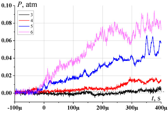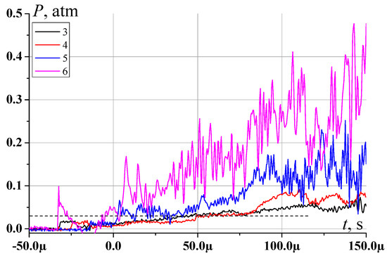 Oscillograms of the pressure near the plate for the same mode are presented in Figure 9. The zero time count began from the moment the flow began. Sensor numbers are shown in the figure. As it approached the body, the pressure increased. In addition, the heterogeneity of the flow increased, which is evident from the increased signal oscillations. At sensor 6, located behind the bow shock wave, the pressure fluctuations were the strongest. The dotted line on the graph indicates the calculated pressure in the area where the model was located in its absence, without taking into account the growth of the boundary layers.