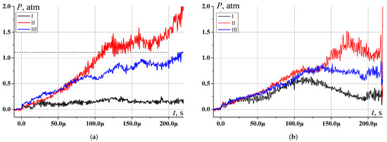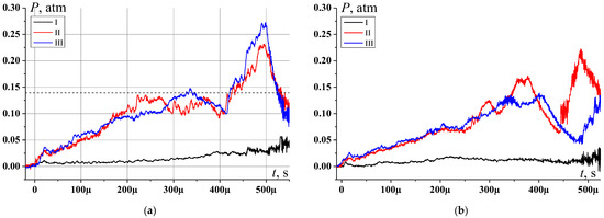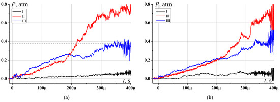 Figure 10 shows pressure oscillograms near the model when moving away from the plate, which were obtained for a round shape (Figure 10a) and for an elliptical shape (Figure 10b). A characteristic feature for both forms is that the pressure at the sensor (I) near the plate was lower than the pressure at a distance from the plate. For the elliptical shape in this mode, this characteristic was less pronounced. The dotted line in Figure 10a shows the calculated pressure at the frontal point of the body without taking into account the boundary layers. It can be seen that the pressure at the model away from the plate (sensor III) was close to this value.