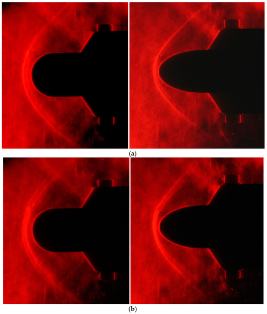 Figure 14. Schlieren patterns of stationary flow around a rounded model (left) and elliptical model (right) for two moments of time for mode 3 (Xe, Re = 45,000): (a) 160 μs and (b) 260 μs.