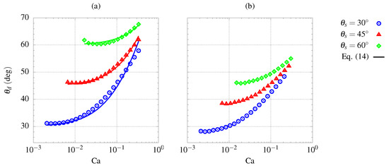 In Figure 3a, the computed dynamic contact angle of the moving contact line is compared with the one predicted by the well-known Hoffman–Voinov–Tanner law [17,37],