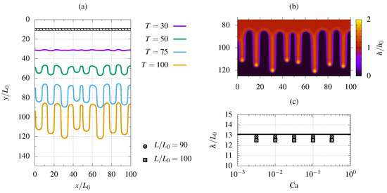 To extend the code validation to problems involving the transition from a continuous film regime to a rivulet pattern, we investigated the finger instability of an advancing film front down a vertical plate. Thus, the liquid is injected through the topmost section of the plate, located at , while the fully developed flow condition, Equation (9), is applied through the bottom-most section, at . The symmetry condition, Equation (11), is applied though the lateral boundaries, located at . The liquid layer is initialized at with the precursor film thickness (i.e., an initially dry domain is considered) according to Equation (12). To perturb the advancing film front, a horizontal stripe of width , characterized by a non-uniform contact angle, was implemented at , while a uniform substrate wettability was applied to the rest of the computational domain. Computations were run for different values of the capillary number, with ranging between and 1. Since the boundary effects may affect the number of rivulets, the plate width must be large enough to ensure a sufficient number of rivulets to form. Two domains of different sizes were investigated: and . The precursor film thickness was set to , and the exponents of Equation (3) were set to . According to the grid dependency analysis, a spatial discretization step of was imposed. An adaptive time step size was used applying Equation (7). The static contact angle was set to over the homogeneous region of the computational domain, while a random distribution with was implemented along the heterogeneous stripe of width and located at . The investigated is consistent with the value reported in [1], in which the authors experimentally investigated the finger instability of different liquids flowing down an inclined plate. After the advancing liquid front meets the heterogeneous stripe, the induced spanwise perturbances propagate and finger instability is observed: the number of rivulets N and, thus, the average rivulet spacing (i.e., the wavelength ) were traced. The computations were stopped when the first advancing rivulet front reaches the outlet section. Figure 5a shows the contact line evolution for , : eight rivulets are observed, corresponding to an average wavelength of . Figure 5c compares the computed wavelength with the most unstable wavelength , provided by the linear stability analysis of [16]: the imposed capillary number does not affect the number of detected rivulets; the numerical wavelength is close to the expected value ( for the domain). Small discrepancies between the numerical data and stability analysis are coherent with the boundary effects, determined by a computational domain of finite width .