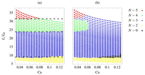 The maximum number of rivulets at the onset of the instability (let us call it ), detected during the first stage of the simulations, is shown in Figure 7a. It is interesting highlighting that a change in the number of rivulets always occurs at fixed values of the non-dimensional wall distance (i.e., depends on the parameter rather than ). This is consistent with the linear stability analysis of [16], where the instability of an advancing 1D film front to spanwise perturbances was analyzed assuming lubrication approximation. It was found in [16] that, for a fully wettable substrate (i.e., ), the most unstable wavelength is , with a weak influence of the static contact angle. This means that, when finger instability is observed, the spanwise distance between neighbor rivulets is expected to be equal to , as experimentally observed by [1]. Figure 7a shows that rivulets at a distance smaller than are induced by the presence of the lateral walls. It is important to mention that rivulet spacing lower than were numerically observed also by [16] in the case of finger instability of a film down a heterogeneous substrate, characterized by a non-uniform surface wettability. However, increasing the wall distance (i.e., decreasing the influence of boundary effects), the number of rivulets detected during the first stage of the computations becomes proportional to the most unstable wavelength: