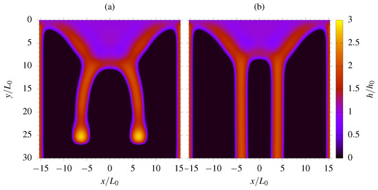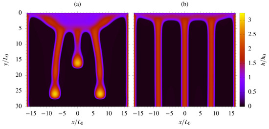 Decreasing the non-dimensional wall distance yields a reduction in the number of rivulets, as proved by Figure 9a and Figure 10a, referring to , with four rivulets detected at the onset of the instability. Again we observe that in Figure 9b, while only three stationary rivulets, i.e., , are observed for a higher film capillary number in Figure 10b, meaning that the dry patch apex enclosed between the central rivulets moves downward so that the two central rivulets coalesce into a single one. As pointed out, depends only on the geometrical parameter according to the linear stability analysis, while the number of stationary rivulets N changes with both and . To better understand such a complex behavior, the width of the steady rivulets was computed, looking for a possible threshold based on the minimum dimension that a rivulet can assume.