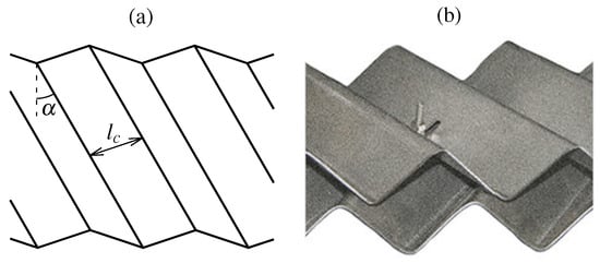 Structured packing geometry: corrugation length and corrugation angle of the corrugated sheet (a); packing element (b).