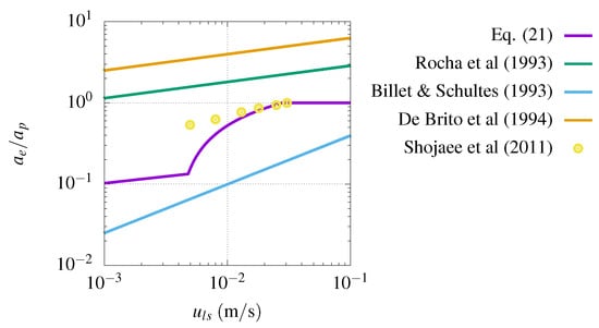 To verify the consistency of the proposed modelization, the effective interfacial area, calculated via Equation (21), is compared in Figure 13 with the empirical correlations [22,23,24,25] listed in Table 1 and with the numerical data of [26]. Liquid water, , and , flowing down the Gempak-2A structured packing, , and , was considered according to [26]. The static contact angle was set to , which is close to the value reported in [26] and is consistent with water on metal surfaces.