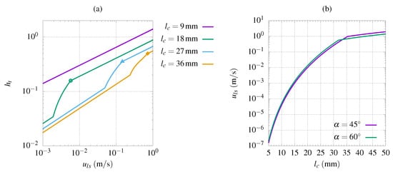 To show the practicality of the proposed modelization, Equation (21) is used to calculate the liquid holdup as a function of the liquid superficial velocity and of the structured packing geometry: the liquid holdup is a crucial operative parameter since it provides a direct prediction of the flooding occurrence (observed when ) and allows for estimating the gas pressure drop; the liquid superficial velocity is one of the input parameters for the utilization of a packed column. The 1-methylepiperazione, which is used as a liquid solvent for absorption in structured packing [29], is chosen: , , . The static contact angle is set to . Figure 14a provides a chart to determine from for different corrugation geometries. The colored markers identify the transition between the rivulet pattern to a continuous film and, thus, correspond to the minimum liquid superficial velocity, which gives the maximum interfacial area, i.e., . The definition of such a threshold for is crucial for proper structured packing design since it allows for minimizing the liquid holdup (i.e., reduce the risk of flooding) and enhance the interfacial area (i.e., augment the mass transfer rate). The minimum superficial velocity giving is shown in Figure 14b as a function of the corrugation length for two values of the corrugation angle.