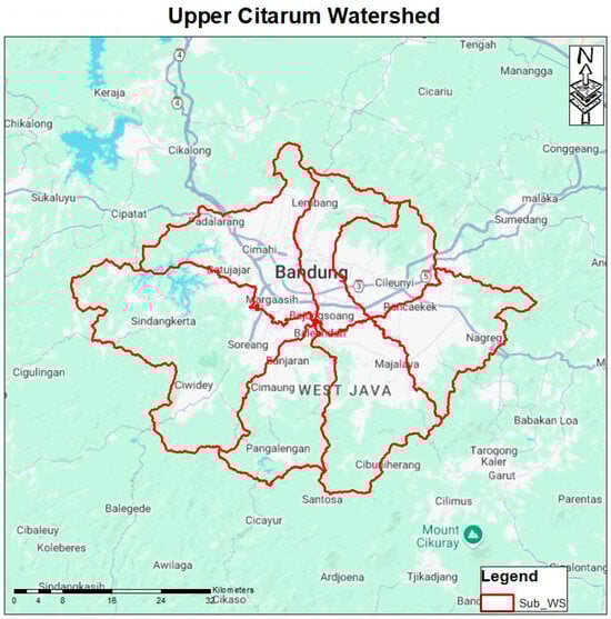 The Upper Citarum Watershed is located in the West Java Province, Indonesia, and spans an approximate area of 2500 km2 as shown in Figure 1. This watershed is one of the most crucial water resources in Indonesia, supporting the economy, the water supply, and the overall development in Jakarta through the West Tarum Canal [8]. The watershed experiences a monsoonal climate influenced by monsoon winds from Australia and Asia, making it vulnerable to El Niño events [9,10,11]. As the largest watershed in West Java, it plays a vital role in regional water management [12].