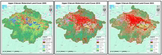 Land Use Change from 2000, 2010, and 2023 in the Upper Citarum Watershed.