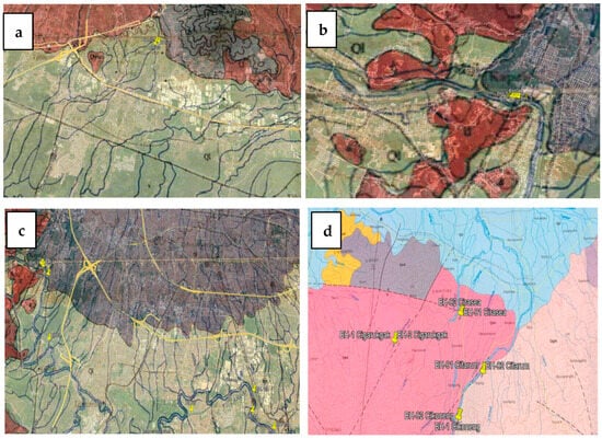 Figure 4 presents the geological maps of the Upper Citarum Watershed (a) Cikeruh Sediment Trap; (b) Nanjung Diversion Tunnel; (c) Citarum Main River; and (d) Component C Check Dam. Based on these geological maps, the watershed is mainly located around areas high in Lake Deposits Formation (Ql), which consists of tuffaceous clay, sandstone, gravel, and conglomerate. Locally, the soil forms horizontal layers and contains limestone concretions, plant remains, freshwater molluscs, and bones of vertebrates. However, the central part features a mix of volcanic sediments from the Malabar–Tilu Volcanic Formation (Qmt). It contains ancient lakebed deposits in certain areas and also river alluvial sediments within the narrow valleys of major rivers.