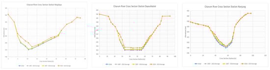 The river flow that was used for this analysis was based on the discharge gauge measurements at Majalaya, Dayeuhkolot, and Nanjung in the 2000–2023 period. An unsteady hydrodynamics flow approach was used in this simulation by considering the data availability and output from the HEC-RAS model. An unsteady flow approach simulation can be run in the HEC-RAS without the sediment data. Unsteady flow conserves mass and accounts explicitly for volume change, which is particularly applicable for reservoir modelling, models with lateral structure flows, and reverse flows.