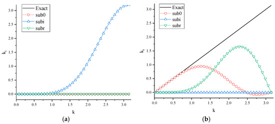 where is the scaled wavenumber and and represent the real and imaginary parts of the modified wavenumber, commonly associated with the dispersion and dissipation properties of the scheme, respectively. According to Equation (3), the specific forms of and are
