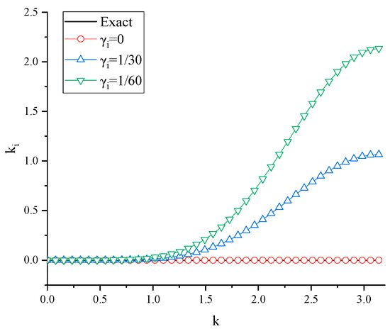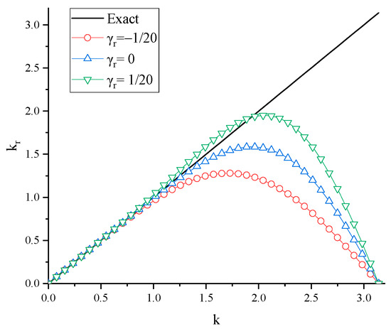 Figure 2 shows that the dispersion of the scheme is nearest to the exact solution when . When , is greater than the exact solution for the local wavenumbers (from ~1.0 to 2.0). By contrast, is determined to be less than the exact solution for other wavenumbers. Figure 3 shows that the dissipation property of the scheme is dependent on the size of , especially at high wavenumbers (up to 2.0).