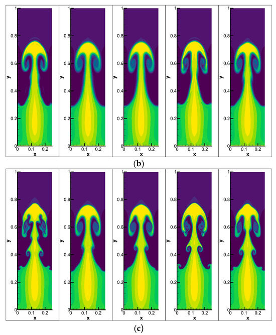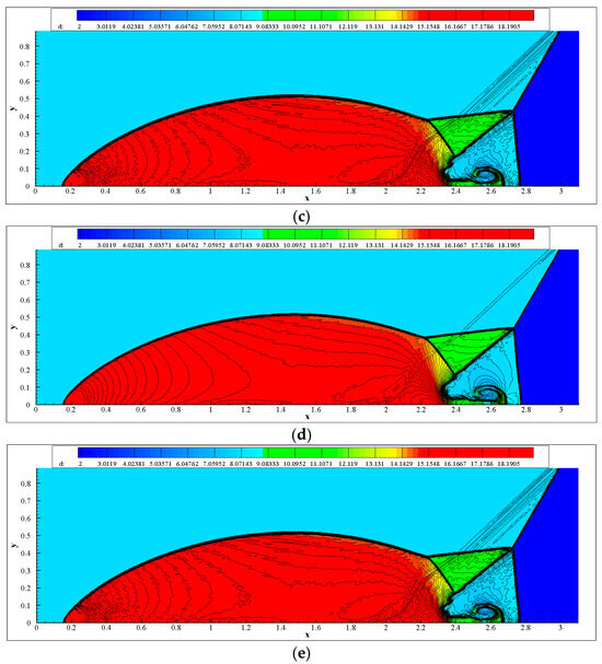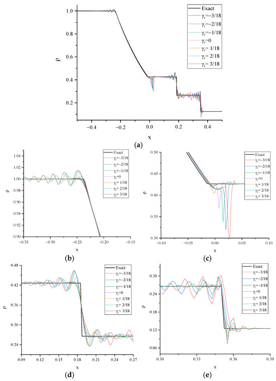 As shown in Figure 4a, the amplitude of oscillations near the discontinuity varies depending on the value of the coefficient. The solutions near the expansion wave are presented in Figure 4b,c. There seems to be a clear trend in the numerical oscillations near the expansion wave. Downstream of the expansion wave, the amplitude of the numerical oscillation increases with an increase in , while upstream of the expansion wave, the numerical oscillation decreases as increases. The numerical results presented near the contact discontinuity in Figure 4d indicate that prior to the contact discontinuity, an increase in leads to heightened numerical oscillations; conversely, beyond the contact discontinuity, an increase in effectively suppresses these oscillations. A similar conclusion is evident from the numerical results near the shock wave. As illustrated in Figure 4e, achieving smaller numerical oscillations requires a lower value before the shock wave and a higher value afterward. It is evident that to suppress numerical oscillations, the control principle for remains consistent across various types of flow field discontinuities. Specifically, should be negative before the discontinuity and positive after it. These results offer valuable insights into the influence of in terms of controlling the oscillations. Moreover, it is deemed crucial to develop a method for detecting discontinuities in the flow field as this would provide a better understanding of the occurrence of such disruptions.