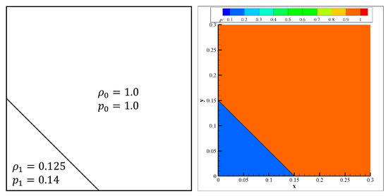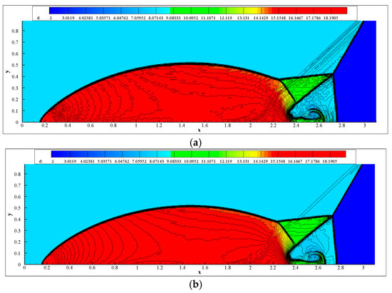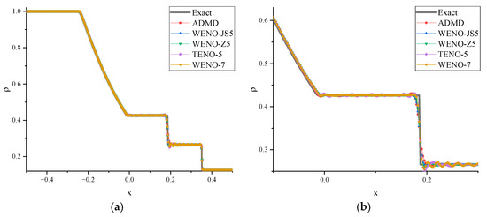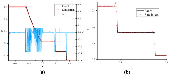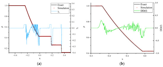 Thus, to increase the stability of the algorithm, a low-order preprocessing method is employed to calculate the . When solving the Euler equation with a high-order scheme, a first-order scheme is employed to obtain sufficiently smooth results for the s. Because solutions of the first-order scheme are sufficiently smooth without any numerical oscillations, the transition of is described to be smooth enough to effectively suppress the numerical oscillations. Similarly, the Riemann problem is applied to test the reasonability of this hypothesis. The numerical and exact solutions of the Riemann problem are presented in Figure 6.