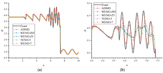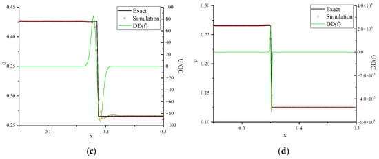As shown in Figure 6, fluctuations in only appear during the expansion wave areas and have no effect on the simulation. Interestingly, = 0 in the smooth areas; thus, these calculation results have fifth-order accuracy. The results in this section indicate that the proposed ADMD scheme achieves adaptive dispersion control through the . As shown in Figure 6b–d, the s accurately capture discontinuities in the flow field.