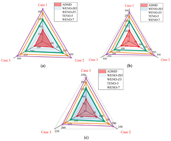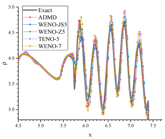 The analysis shown in Figure 7b reveals that the WENO-type scheme enhanced dissipation at medium and high wave numbers, ensuring the stability of the calculation. Particularly, the WENO-JS5 scheme exhibited the highest dissipation. Compared to the dissipation properties of WENO-JS5 and WENO-Z5, those of TENO-5 demonstrated superior performance, even surpassing the seventh-order WENO scheme. The TENO-5 scheme showed significant advantages in terms of controlling numerical dissipation. Notably, ADMD exhibited exceptional performance in dissipation properties, with dissipation levels approaching zero. By adjusting dispersion coefficients adaptively in flow fields with diverse properties, ADMD was able to minimize its reliance on numerical dissipation for calculation stability, thereby demonstrating outstanding dissipation and dispersion properties simultaneously. It is worth noting that due to the inability to capture discontinuities, the dissipation and dispersion presented here do not adequately represent the true effects observed in actual simulations.