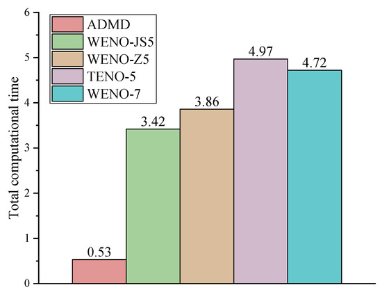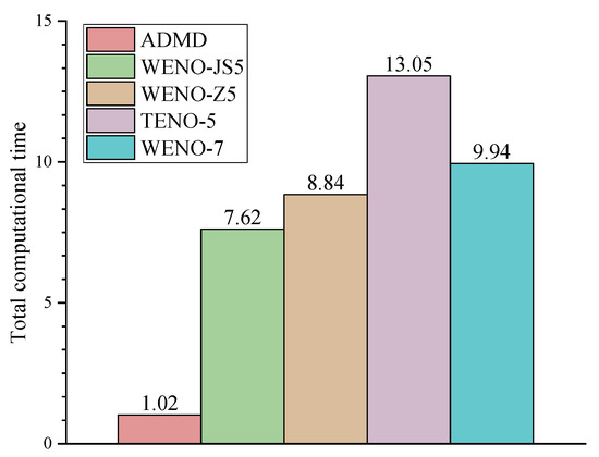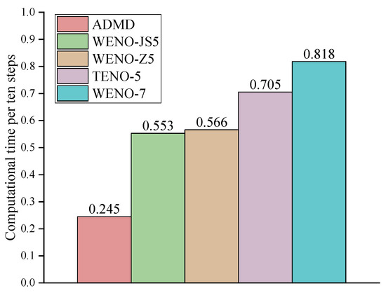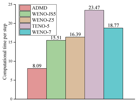 Among them, the operator represents the volume average for this quantity. The computational costs of the five schemes are summarized in Figure 34. In Figure 35, the temporal evolution of Taylor Reynolds number, normalized turbulent kinetic energy, normalized turbulent Mach number, velocity derivative skewness, and normalized RMS of density for the ADMD, WENO-JS5, WENO-Z5, TENO-5, and WENO-7 schemes is presented, with representing the large-eddy-turnover time at the initial time [37]. The DNS data from Samtaney et al. [38] serve as a reference point for comparison.
