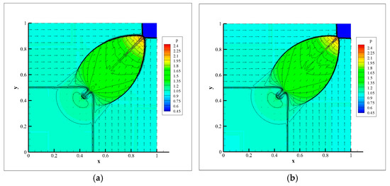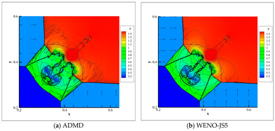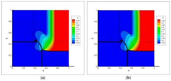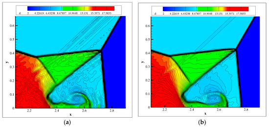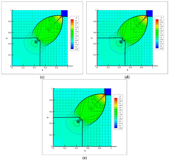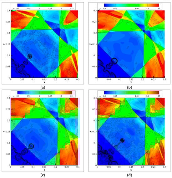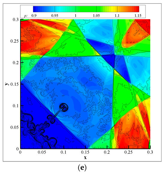 Figure 5 confirms that this control method effectively reduces the numerical oscillations in the majority of the computational domains. However, numerical oscillations still occur near the expansion wave and contact slip line. Moreover, weak oscillations appear during the shock wave and on the contact slip line. This may be attributed to the transition of being not smooth enough; meanwhile, the fluctuation of in smooth areas means that the accuracy of the scheme cannot reach the fifth order. Numerical oscillations in the flow fields can further generate fluctuations in .