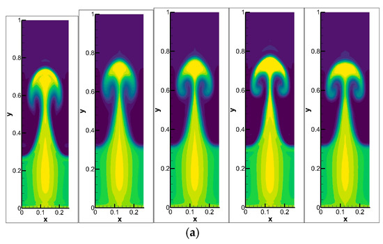 - Jiang, G.S.; Shu, C.W. Efficient implementation of weighted ENO schemes. J. Comput. Phys. 1996, 126, 202–228. [Google Scholar] [CrossRef]