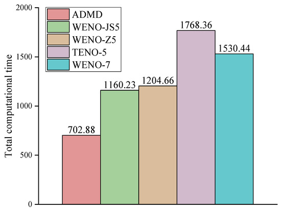 As shown in Figure 34, the ADMD scheme maintained a notable edge in terms of reducing computational resource consumption in three-dimensional numerical calculations. Compared to the WENO-JS5, WENO-Z5, TENO-5, and WENO-7 schemes, the ADMD scheme showed an efficiency improvement of 47.8%, 50.6%, 65.5%, and 56.9%, respectively.