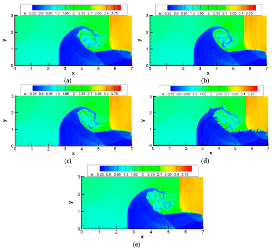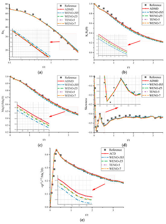 Our study findings are consistent with those of Samtaney [38], indicating the effectiveness of the calculation methods utilized. Analysis of the Taylor Reynolds number decay curve, as depicted in Figure 35a, showed that the results of the ADMD, WENO-Z5, TENO-5, and WENO-7 schemes aligned closely with Samtaney’s results, while the WENO-JS5 scheme displayed slightly higher values. Moreover, Figure 35b,c suggest that the turbulent kinetic energy and turbulent Mach number decayed more rapidly in the calculation of the WENO-JS5 and WENO-Z5 schemes, indicating increased dissipation during calculations. The ADMD and TENO-5 schemes performed well, consistent with Samtaney’s results and comparable to the WENO-7 scheme. Figure 35d demonstrates the velocity derivative skewness attenuation curve, a high-order statistic sensitive to small scales in the flow field. The results of this study are consistent with the existing literature, indicating the effectiveness of the ADMD scheme in capturing medium and small scales in the flow field. Furthermore, Figure 35e emphasizes the ADMD scheme’s superior ability to reduce numerical dissipation. In the time decay curve of the normalized RMS of fluctuation density, only the ADMD and TENO-5 schemes corresponded to Samtaney’s results; meanwhile, the other schemes exhibited faster decay, indicating higher dissipation in the WENO-JS5, WENO-Z5, and WENO-7 schemes than in the ADMD and TENO-5 schemes.