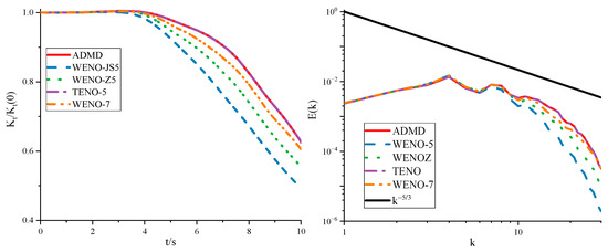 Time evolution of the normalized kinetic energy (left) and energy spectrum for five schemes at t = 10 s (right).